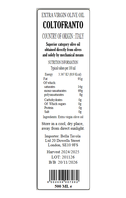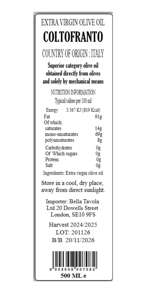Stored in stainless steel tanks below nitrogen, it's characterized by low acidity and high polyphenolic charge: this oil contains at least 250mg/kg of hydroxytyrosol and its derivatives (e.g. oleuropein complex and tyrosol).